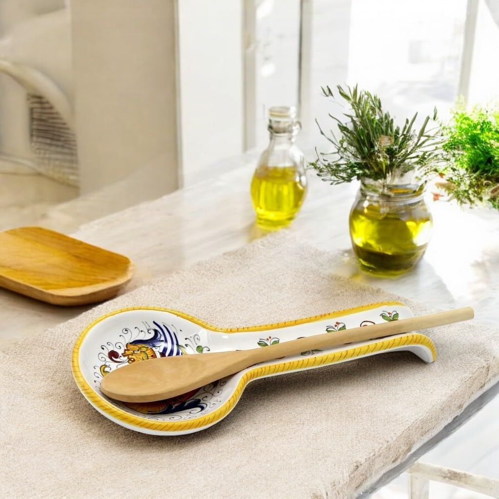 This exquisite piece showcases the iconic Raffaellesco pattern, a hallmark of Italian majolica from Deruta. Revered for its enduring appeal, this design has captivated admirers for centuries. Originating in the 16th century, Raffaellesco was inspired by the elegant arabesques found in Raphael’s frescoes. At its heart lies a stylized dragon, a symbol of a benevolent deity believed to grant good fortune and favorable winds to seafaring merchants—a meaningful touch for those seeking prosperity and protection. Our Raffaellesco Deluxe collection embodies authentic, top-tier craftsmanship, staying true to the original designs and patterns. Each piece is a tribute to Italy’s rich cultural heritage and artistic traditions, offering a timeless connection to its storied past. Handcrafted in Deruta, a medieval hilltop town renowned for its ceramic mastery since the 12th century, this authentic maiolica (majolica) creation is a testament to the region’s unparalleled artistry. Expertly hand-painted by master artisans, each piece features classic Renaissance colors—royal blue, golden yellow, and deep forest green—creating a striking visual contrast. Whether displayed in your kitchen, dining area, or living space, this vibrant ceramic makes a stunning statement. Made with 100% food-safe glazes and colors, this earthenware reflects centuries of tradition and craftsmanship. While dishwasher safe for easy care, we recommend avoiding microwave use, as the ceramic may become very hot. Perfect for elegant gatherings or as a sophisticated accent in your home, this authentic Deruta ceramic is a true investment in beauty, history, and craftsmanship.